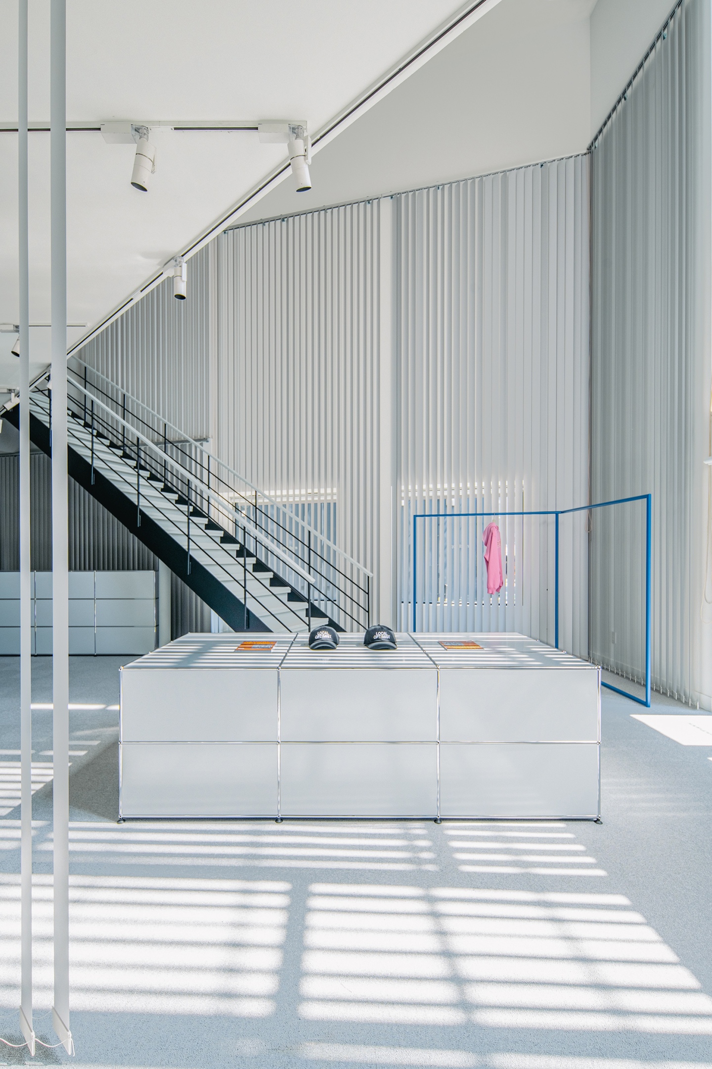 The project is concepted as an ‘open-plan office.’ Drawing inspiration from Tokyo’s influential Metabolism movement, the shop uses office blinds to create a ‘flexible architecture’ that allows the layout to adapt based on its display, use, and program.